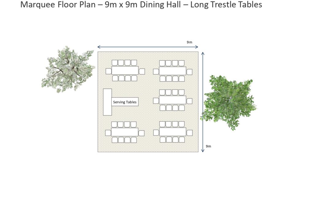 Home / Marquee Floor Plan – 9m x 9m Dining Hall – Long Trestle Tables / LongTrestle-Marquee-9×9-img